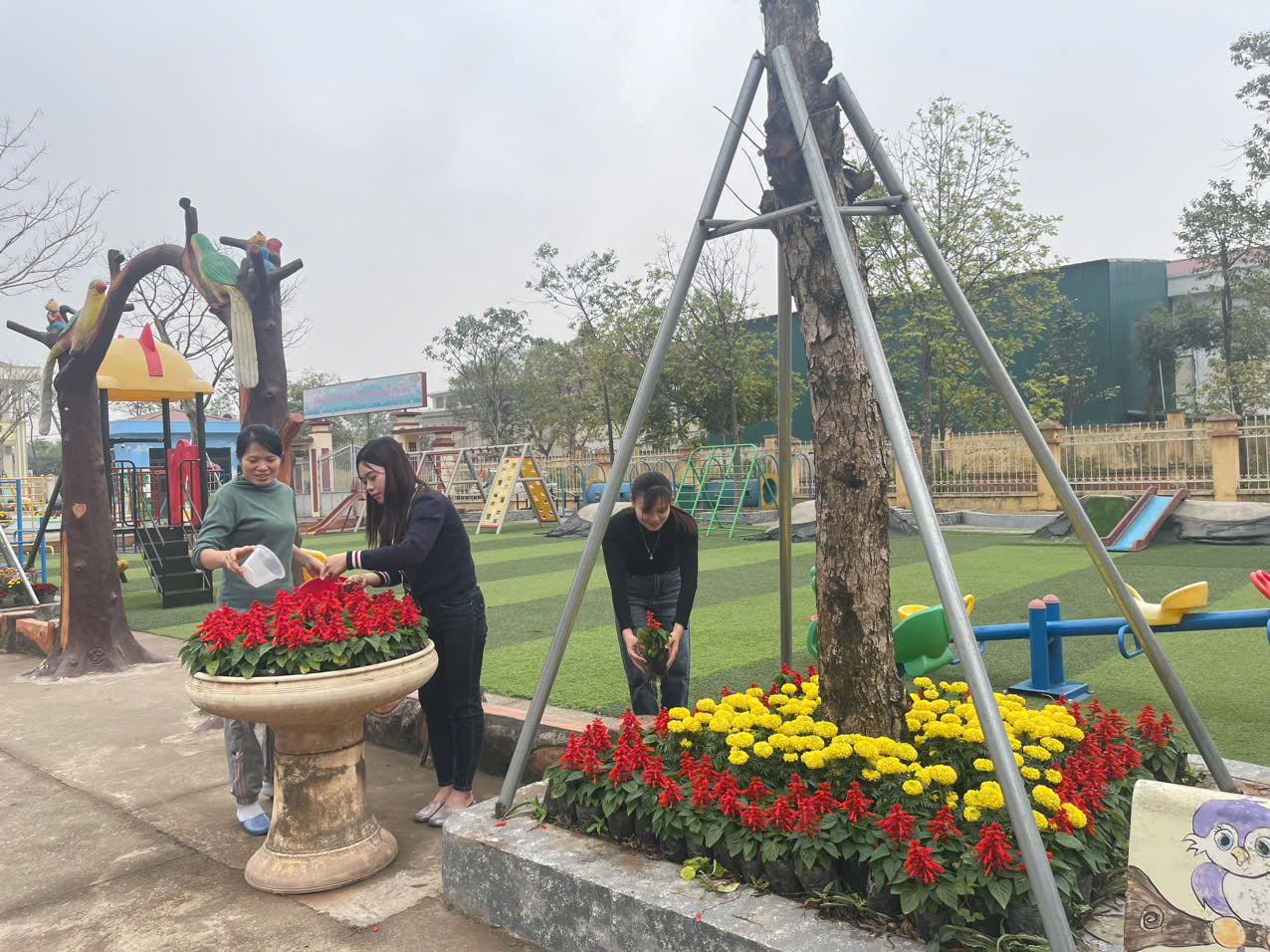 Ngay từ sáng sớm, không khí tại trường đã trở nên rất nhộn nhịp. Các cô giáo và nhân viên trong trang phục lao động cùng nhau tích cực tham gia với tinh thần phấn khởi. Nhiều loại hoa được trồng thêm như hoa Dạ yến thảo, sen đá, hoa xác pháo, hoa đào, hoa cúc và cây xanh bổ sung tại khu vực sân trường, tạo nên một không gian tươi mát, rực rỡ sắc xuân. Bên cạnh đó, những góc chơi của trẻ được trang trí bằng các tiểu cảnh Tết truyền thống như cây nêu, bao lì xì, cây hồng, cây kim ngân lượng....mâm ngũ quả thu hút nhiều sự chú ý.